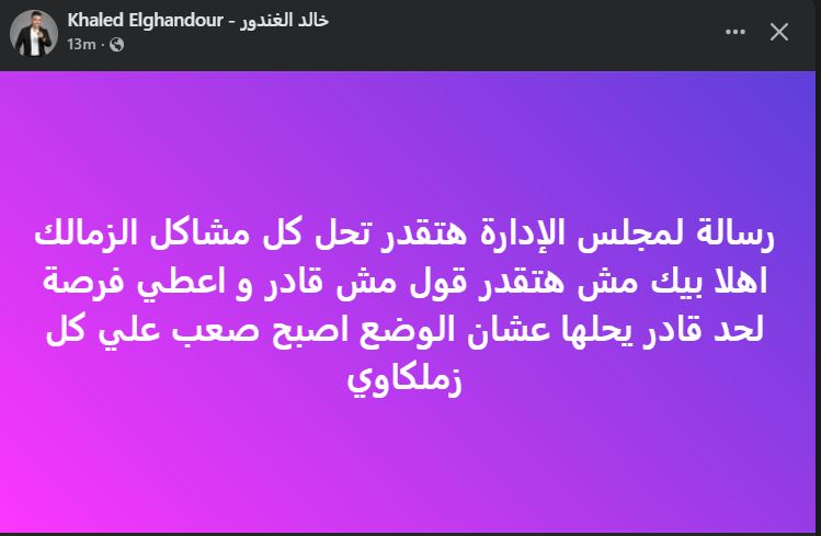 تحيا مصر، وكتب خالد الغندور عبر حسابه الرسمي "فيس بوك": رسالة لمجلس الإدارة هتقدر تحل كل مشاكل الزمالك اهلاً، بيك مش هتقدر قول مش قادر واعطي فرصة لحد قادر يحلها عشان الوضع أصبح صعب علي كل زملكاوي ".