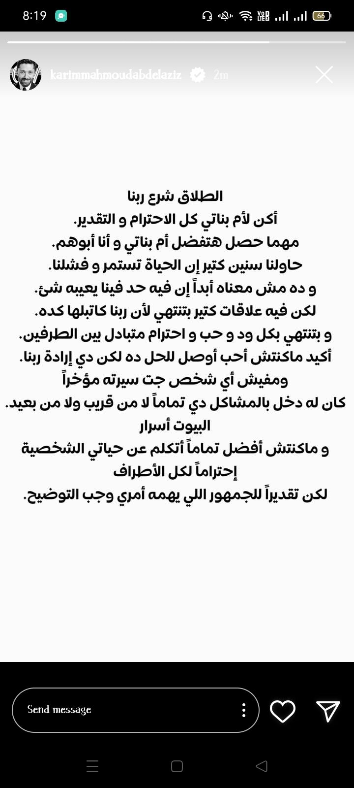 كما أكد كريم أن الطلاق بينه وبين زوجته آن الرفاعي كان قراراً صعباً، لكنه جاء وفق إرادة الله، وقال وفقًا لما رصد موقع تحيا مصر: "الطلاق شرع ربنا أكن لأم بناتي كل الاحترام والتقدير، ومهما حصل ستظل دائمًا أم بناتي وأنا أبوهم حاولنا لسنوات عديدة إن الحياة تستمر، ولكن فشلنا وهذا لا يعني أن هناك أي قصور من أي طرف"، وأضاف: "هناك علاقات كثيرة تنتهي، وهذه هي إرادة الله وتنتهي بكل ود وحب واحترام متبادل".