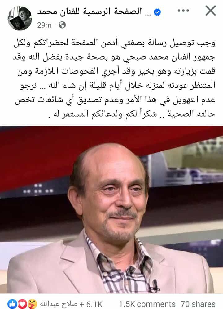 حرص الادمن الخاص بـ صفحة الفنان محمد صبحي على طمئنة الجمهور على حالته الصحية، وذلك بعد انتشار العديد من الأنباء غير الصحيحة حول حالته الصحية، أو شائعات وفاته.
