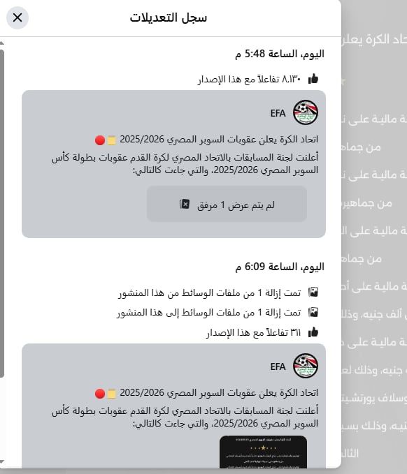 وأصدرت الصفحة الرسمية للاتحاد المصري لكرة القدم، عبر منصة التواصل الاجتماعي “فيسبوك” تعديلًا على منشور العقوبات بعد إصداره بـ11 دقيقة، والتي لم تتضمن عقوبات على الأهلي، ولاعبه أحمد سيد زيزو.