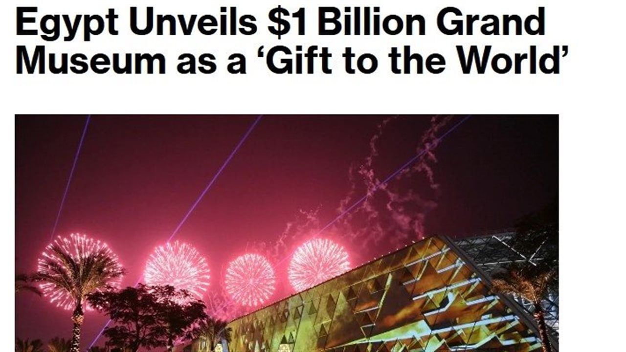 سلطت شبكة "بلومبرج" الأمريكية الضوء على افتتاح المتحف المصري الكبير ونشرت فى تقرير لها تحت عنوان "مصر تكشف عن متحف كبير بتكلفة مليار دولار "هدية للعالم" إن المتحف المصري الكبير يضم أكثر من 100،000 قطعة أثرية تعود إلى سبعة آلاف عام من التاريخ، وقد وُصف بأنه "هدية من مصر إلى العالم".