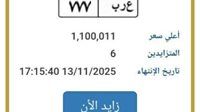 اشتعلت المزايدة الإلكترونية على لوحة سيارة مميزة تحمل حروف وأرقام «ع ر ب 777»، عبر بوابة مرور مصر الإلكترونية، بعدما تجاوز سعرها حاجز المليون و100 ألف جنيه، وسط منافسة بين 6 أشخاص حتى الآن، قبل ساعات من إغلاق المزاد المقرر غدًا الخميس 13 نوفمبر 2025.