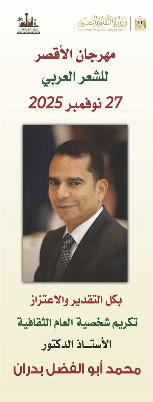 أعلن بيت الشعر بالأقصر عن اختيار الأستاذ الدكتور محمد أبو الفضل بدران شخصية العام الثقافية للدورة العاشرة من مهرجان الأقصر للشعر العربي، والمقرر انعقاده في مدينة الأقصر خلال الفترة من الخميس ٢٧ إلى الأحد ٣٠ نوفمبر ٢٠٢٥، برعاية كريمة من صاحب السمو الشيخ الدكتور سلطان القاسمي حاكم الشارقة، والتنسيق الكامل والتعاون مع وزارة الثقافة المصرية، والهيئة العامة لقصور الثقافة، وجامعة الأقصر، بحضور نخبة من الشعراء والأساتذة النقاد، ولفيف من جمهور الشعر من مثقفي مدينة الأقصر.
