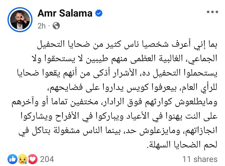 كتب عمرو سلامة في منشور رصده موقع تحيا مصر على حسابه الرسمي بموقع التواصل الاجتماعي فيسبوك: بما إني أعرف شخصيا ناس كثير من ضحايا التحفيل الجماعي، الغالبية العظمى منهم طيبين لا يستحقوا ولا يستحملوا التحفيل ده، الأشرار أذكى من أنهم يقعوا ضحايا للرأي العام، بيعرفوا كويس يداروا على فضايحهم، ومايطلعوش كوارثهم فوق الرادار، مختفين تماما أو وآخرهم على النت يهنوا في الأعياد ويباركوا في الأفراح ويشاركوا انجازاتهم، ومايزعلوش حد، بينما الناس مشغولة بتاكل في لحم الضحايا السهلة.