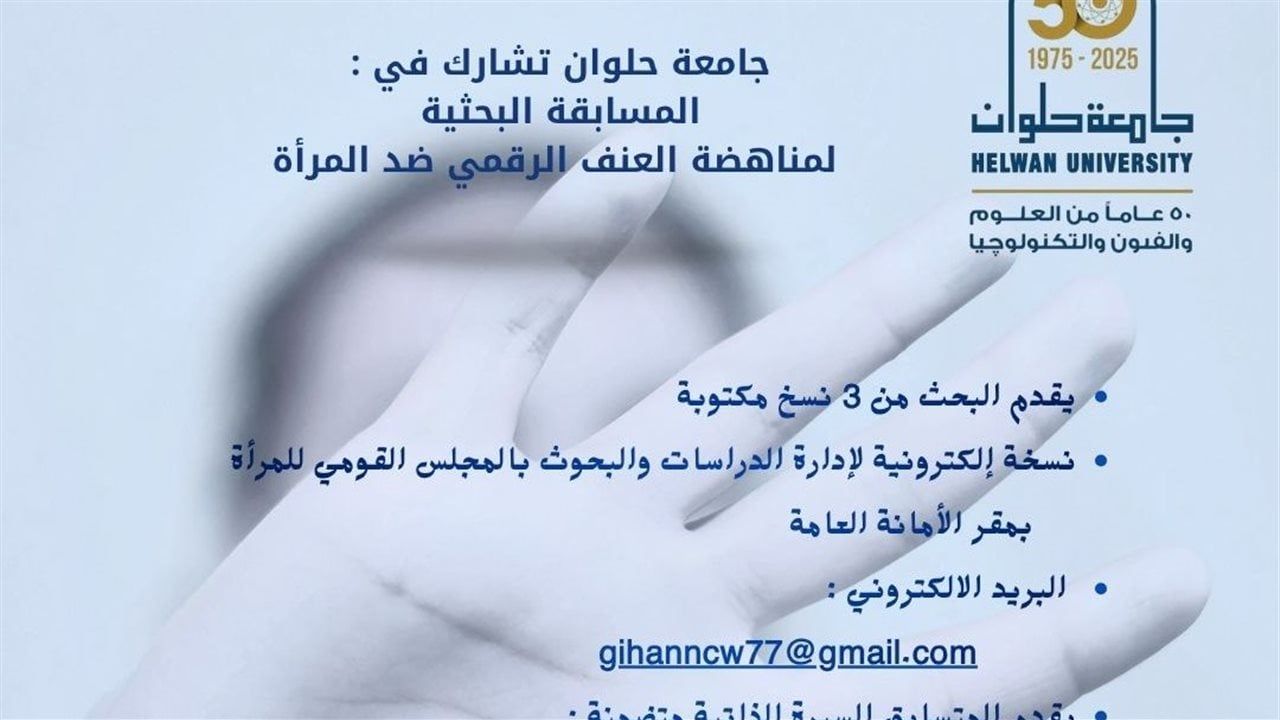 تشارك جامعة حلوان، ممثلة في وحدة مناهضة العنف ضد المرأة، في المسابقة البحثية التي أعلن عنها المجلس القومي للمرأة بالتعاون مع صندوق الأمم المتحدة للسكان تحت عنوان "العنف ضد المرأة الذي تيسره وسائل التكنولوجيا"، ضمن فعاليات حملة الـ16 يومًا لمناهضة العنف ضد المرأة لعام 2025، التي تُقام تحت شعار "End Digital Violence Against all Women and Girls"، تحت رعاية الدكتور السيد قنديل رئيس الجامعة، الدكتور وليد السروجي نائب رئيس الجامعة لشئون خدمة المجتمع وتنمية البيئة، وإشراف الدكتورة سماح ربيع مدير وحدة مناهضة العنف ضد المرأة بالجامعة.