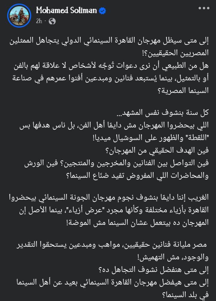 وكتب الفنان محمد سليمان، منشورا يعبر خلاله عن غضبه، وفقا لما رصده موقع تحيا مصر، عبرر صفحته الرسمية على موقع التواصل الاجتماعي فيسبوك، قال فيه: إلى متى سيظل مهرجان القاهرة السينمائي الدولي يتجاهل الممثلين المصريين الحقيقيين؟!، هل من الطبيعي أن نرى دعوات تُوجَّه لأشخاص لا علاقة لهم بالفن أو بالتمثيل، بينما يُستبعد فنانين ومبدعين أفنوا عمرهم في صناعة السينما المصرية؟، كل سنة بنشوف نفس المشهد.