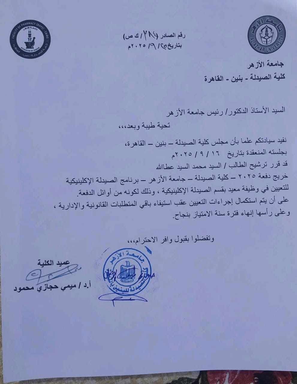 وأكدت الجامعة، أن هذا الخطاب مزورٌ ولا يمت بصلة للإجراءات الرسمية المعمول بها في جامعة الأزهر، وأن التعيينات في وظائف الهيئة المعاونة تخضع لضوابط دقيقة وإجراءات قانونية صارمة تتم عبر القنوات الرسمية وقرارات مجلس الجامعة فقط.