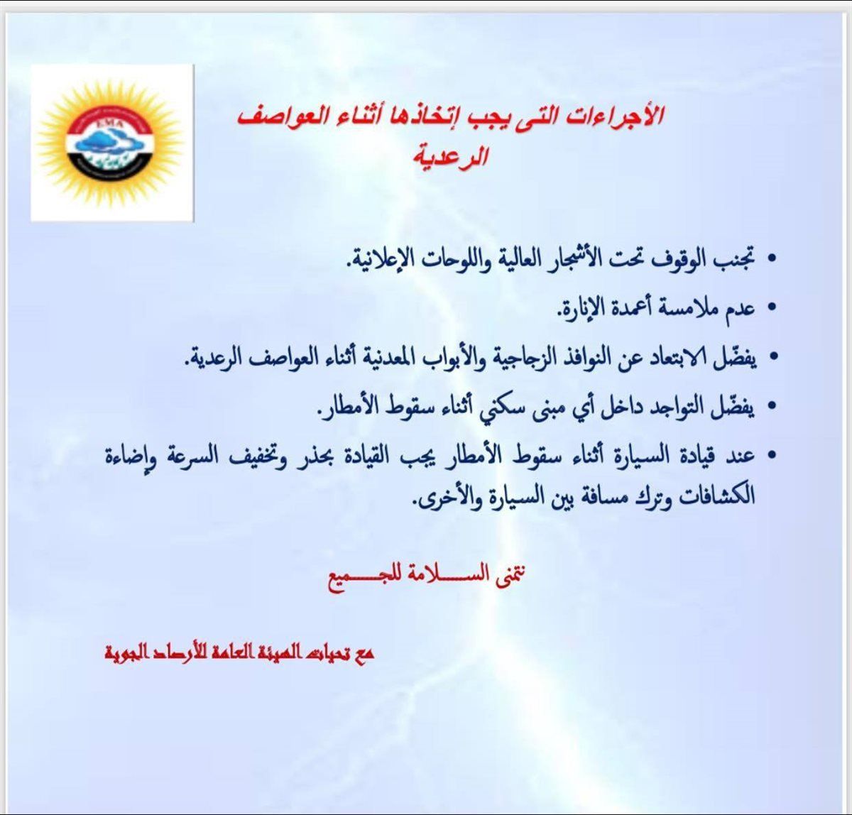 ووجهت الأرصاد 6 نصائح للمواطنين جاءت على النحو التالي: