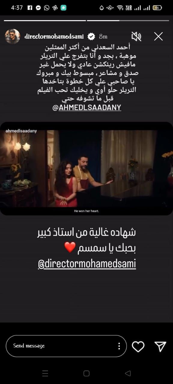وكتبت المخرج محمد سامي، منشورا يوجه من خلاله التهنئة للنجم أحمد السعدني، وفقا لما رصده موقع تحيا مصر، وذلك عبر خاصية استوري صفحته الرسمية على موقع التواصل الاجتماعي إنستجرام، قائلا: من أكثر الممثلين موهبة، بجد وأنا بتفرج على التريلر مفيش ریأکشن عادي، ولا يحمل غير صدق ومشاعر، مبسوط بيك، ومبروك يا صاحبي على كل خطوة بتاخدها، التريلر حلو أوي، ويخليك تحب الفيلم قبل ما تشوفه.