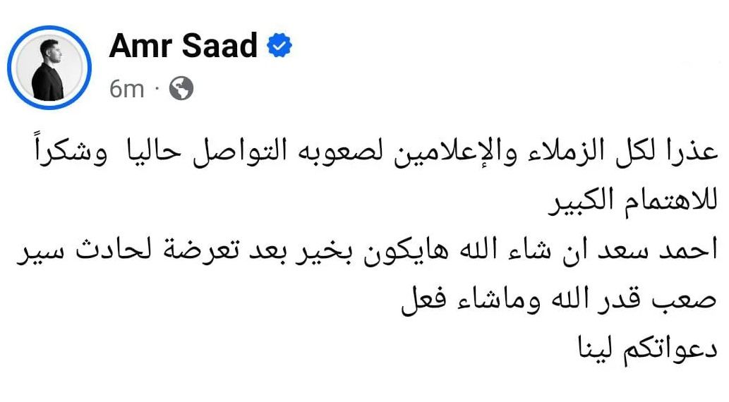 أعلن الفنان عمرو سعد تعرض شقيقه الفنان أحمد سعد لحادث سير، وعلق على صفحته على موقع التواصل الاجتماعي "الفيس بوك" قائلًا: "عذرًا لكل الزملاء والإعلامين لصعوبة التواصل حاليًا وشكرًا للاهتمام الكبير".