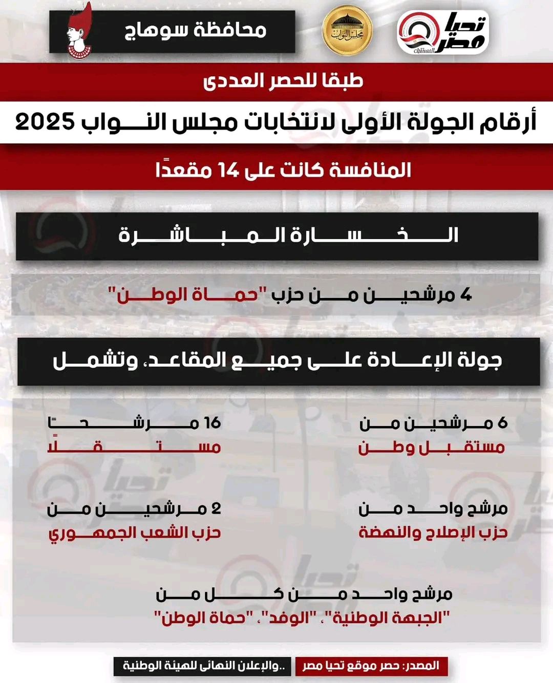 سوهاج.. الجولة الأولى لمجلس النواب 2025 تشهد خسائر لحماة الوطن والإعادة على جميع المقاعد