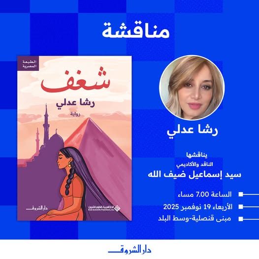 تنظم دار الشروق حفل توقيع ومناقشة رواية "شغف" للروائية رشا عدلي، وذلك يوم الأربعاء المقبل 19 نوفمبر 2025، في تمام السابعة مساء، في مبنى قنصلية بوسط القاهرة.
