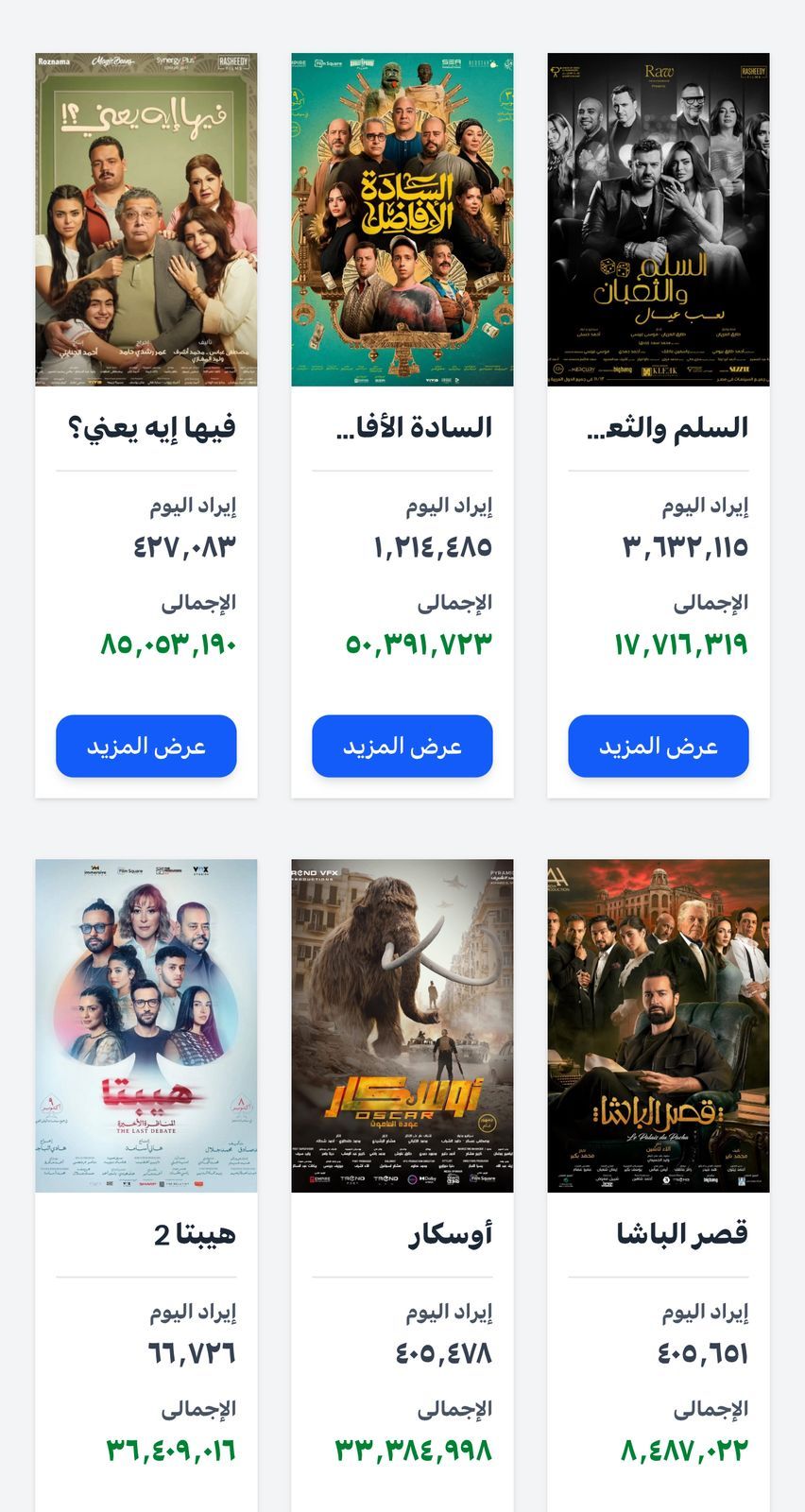 وبرغم المنافسة التي يرصدها موقع تحيا مصر فإن باقي الأفلام جاءت بإيرادات أقل مقارنة بـ السلم والثعبان 2، فقد سجل فيلم السادة الأفاضل أمس مليون و214 ألف جنيهًا، ليحتفظ بمكانه في المراكز المتقدمة نسبيًا، أما فيلم فيها إيه يعني فاكتفى بتحقيق 427 ألف جنيهًا، في حين جاءت النتائج أقل بالنسبة لأعمال أخرى مثل قصر الباشا الذي جمع 405 ألف و651 جنيهًا، يليه فيلم أوسكار الذي حقق 405 ألف و478 جنيهًا، وفي المركز الأخير من حيث الإيرادات اليومية، جاء فيلم هيبتا 2 بإيرادات بلغت 66 ألف و726 جنيهًا فقط.