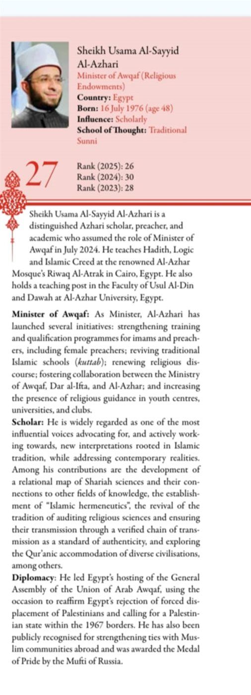 أصدر المركز الملكي للبحوث والدراسات الإسلامية في المملكة الأردنية الهاشمية الكتاب السنوي «أكثر 500 شخصية مسلمة تأثيرًا في العالم» لعام 2025/2026، معلنًا إدراج الدكتور أسامة الأزهري، وزير الأوقاف، ضمن قائمة الشخصيات الإسلامية الأكثر تأثيرًا عالميًا، تقديرًا لإسهاماته البارزة ودوره المؤثر في الساحة الدينية والفكرية.