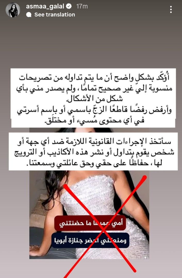 أوضحت الفنانة أسماء جلال أنها ترفض تمامًا إدخال اسمها أو اسم أسرتها في أي محتوى مفبرك أو يحمل إساءة، مؤكدة أنها ستلجأ للإجراءات القانونية ضد أي جهة أو فرد يشارك في نشر هذه الأكاذيب أو يعيد تداولها، لحماية حقوقها وحفظ سمعة عائلتها، وكتبت وفقا لما رصد موقع تحيا مصر: “أؤكد بشكل واضح أن ما يتم تداوله من تصريحات منسوبة إلي غير صحيح تماما ، ولم يصدر مني بأي شكل من الأشكال، وأرفض رفضا قاطعا الزج باسمي أو باسم أسرتي في أي محتوى مسيء أو مختلق، سأتخذ الإجراءات القانونية اللازمة ضد أي جهة أو شخص يقوم بتداول أو نشر هذه الأكاذيب أو الترويج لها ، حفاظاً على حقي وحق عائلتي وسمعتنا ”.