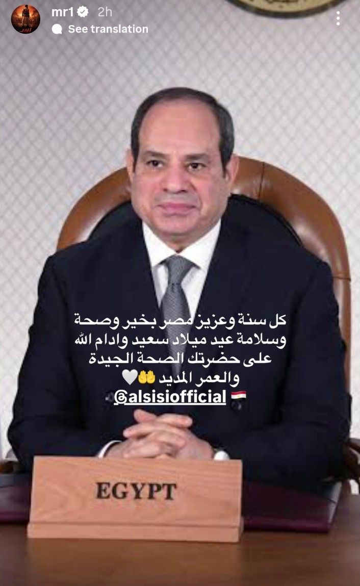 نشر الفنان محمد رمضان صورة للرئيس عبد الفتاح السيسي عبر حسابه الرسمي على موقع تبادل الصور والفيديوهات انستجرام، وعلق عليها موجهًا له رسالة بمناسبة حلول عيد ميلاده علينا اليوم، قال فيها: “كل سنة وعزيز مصر بخير وصحة وسلامة عيد ميلاد سعيد وادام الله على حضرتك الصحة الجيدة والعمر المديد”، وانهالت التعليقات من نجوم الفن ومتابعي محمد رمضان موجهين التهاني لسيادة الرئيس ومعربين عن فخرهم به.