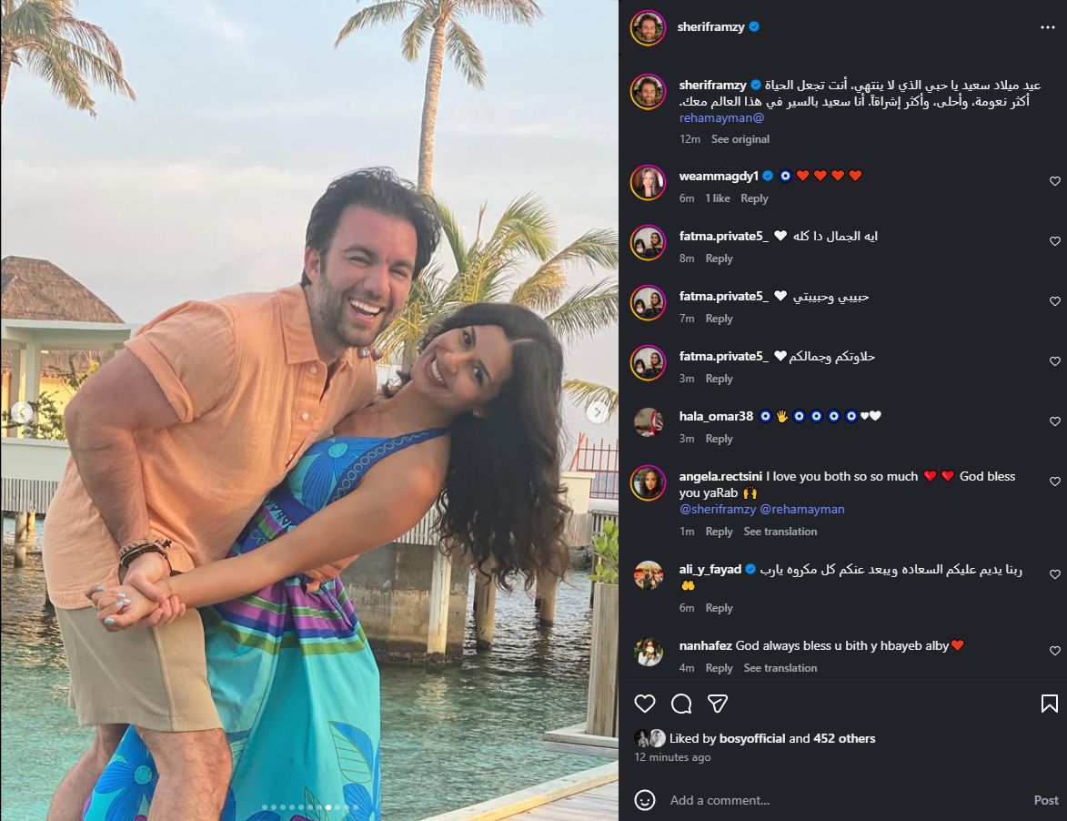 ونشر الفنان شريف رمزي، عدة صور تجمعه بزوجته، وفقا لما رصده موقع تحيا مصر، عبر صفحته الرسمية على موقع التواصل الاجتماعي إنستجرام، وعلق عليها: عيد ميلاد سعيد يا حبي الذي لا ينتهي، أنت تجعل الحياة أكثر نعومة، وأحلى، وأكثر إشراقاً. أنا سعيد بالسير في هذا العالم معك.