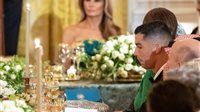 في افتتاح مأدبة العشاء الرسمية التي أقيمت في البيت الأبيض، خطف الرئيس الأمريكي دونالد ترامب الأنظار حين توجه مباشرة إلى النجم البرتغالي كريستيانو رونالدو قائلاً: "وجودك هنا رفع قيمتي في نظر ابني بارون."