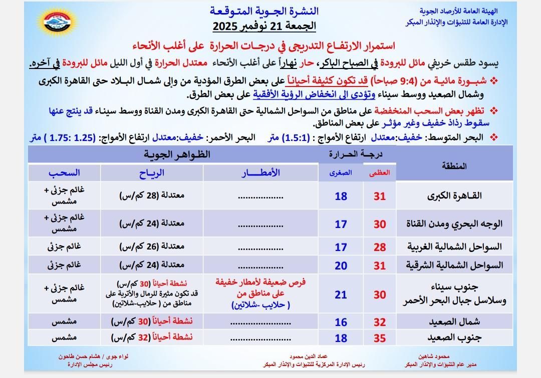 استمرار الارتفاع التدريجى.. تفاصيل حالة الطقس اليوم الجمعة 21 نوفمبر 2025