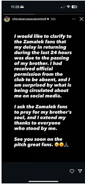 ونشر اللاعب الأنجولي عبر حسابه على إنستجرام قائلًا "أود أن أوضح لجماهير الزمالك، أن تأخر عودتي خلال الـ24 ساعة الماضية كان بسبب وفاة شقيقي".