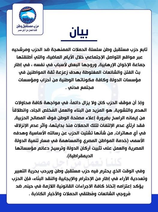 أصدر حزب مستقبل وطن بيانًا رسميًا أكد فيه متابعته لسلسلة الحملات الممنهجة التي استهدفت الحزب ومرشحيه خلال الأيام الماضية عبر مواقع التواصل الاجتماعي، مشيرًا إلى أن تلك الحملات تقودها جماعة الإخوان الإرهابية وعناصر مشبوهة بهدف نشر الفتن والشائعات وزعزعة ثقة المواطنين في مؤسسات الدولة ومكوناتها الوطنية من أحزاب ومجتمع مدني.