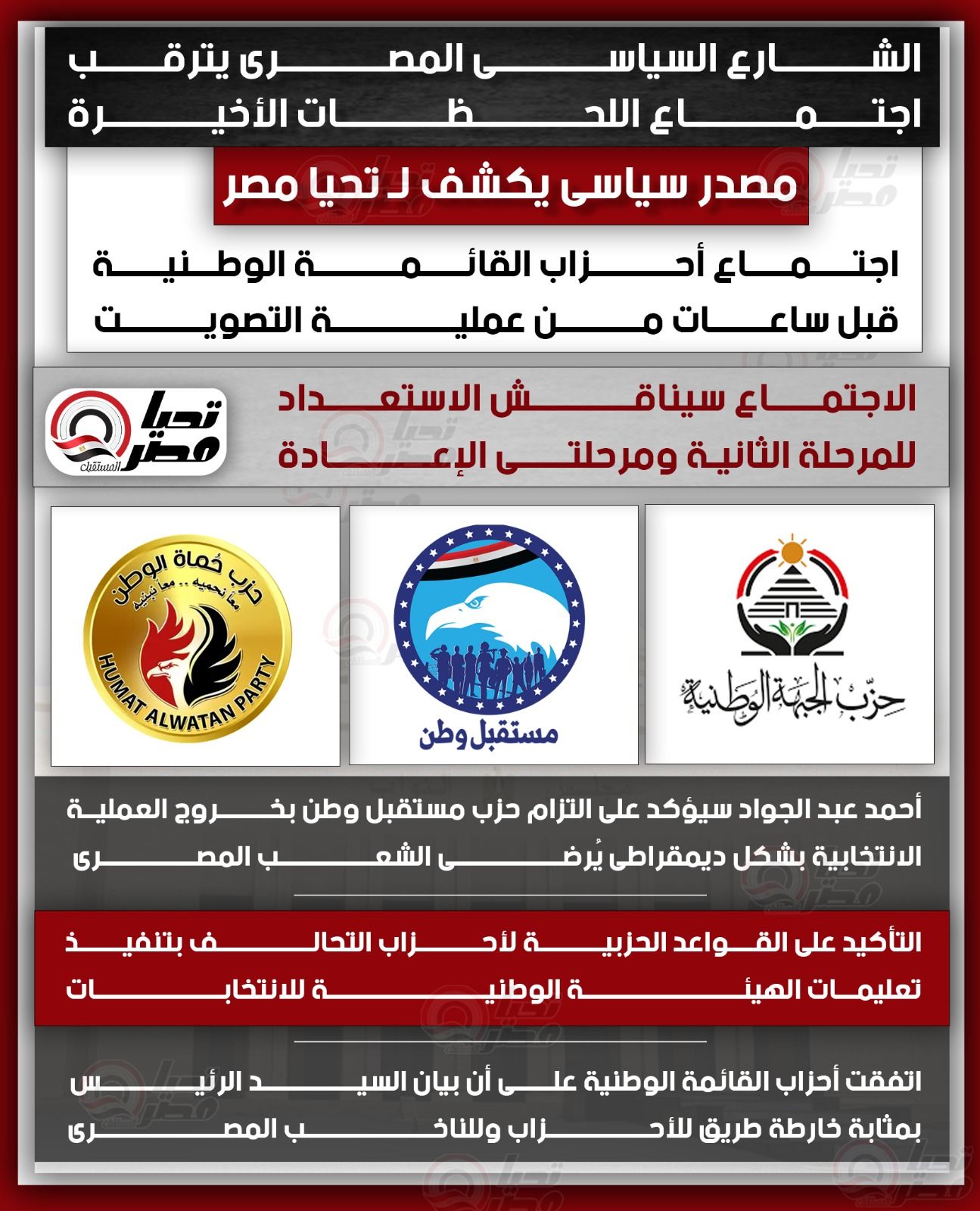 مصدر سياسى يكشف لـ تحيا مصر تفاصيل اجتماع أحزاب القائمة الوطنية قبل ساعات من عملية التصويت