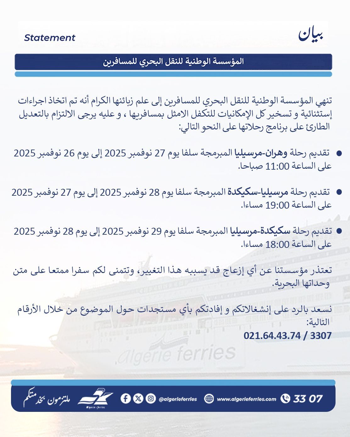 كما تم تقديم رحلة سكيكدة – مرسيليا المبرمجة سلفا يوم 29 نوفمبر 2025 إلى يوم 28 نوفمبر 2025 على الساعة 18:00 مساء.