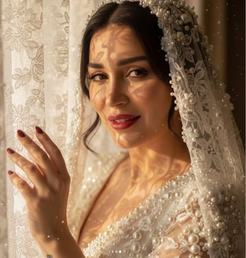شاركت الفنانة مي عزالدين، جمهورها بمواقع التواصل الاجتماعي مجموعة صور لها بفستان الزفاف المرصع باللؤلؤ والدانتيل، مستعينة بتقنيات الذكاء الاصطناعي.