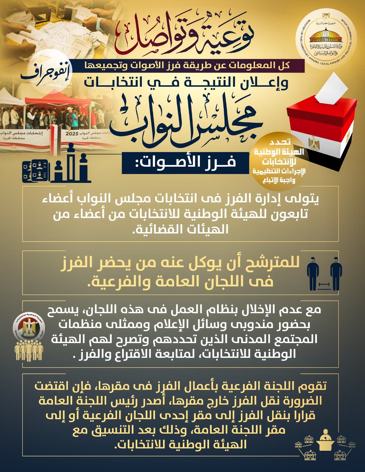 نشرت وزارة الشئون النيابية والقانونية والتواصل السياسي إنفوجرافًا توضح فيه كيفية فرز وتجميع أصوات الناخبين في انتخابات مجلس النواب الحالية وفق ضوابط الهيئة الوطنية للانتخابات.