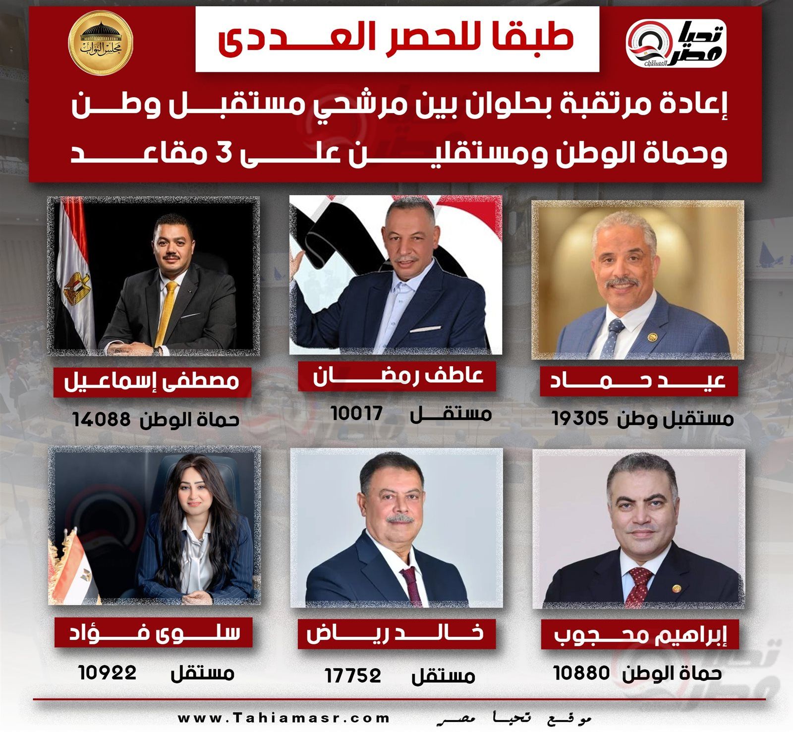 وحصل مرشح حزب مستقبل وطن عيد حماد على 19305 صوتا، بينما حصل مرشح حزب حماة الوطن مصطفى إسماعيل على 14088 صوتا، فيما حصل مرشح حماة الوطن الثاني إبراهيم محجوب على 10880 صوت، وحصل خالد رياض المرشح المستقل على 17752 صوتا، فيما حصل المرشحة المستقلة الأخرى سلوى فؤاد على 10922 صوتا، وستجرى جولة إعادة بينهم من أجل تحديد الثلاث مقاعد المخصصين للدائرة داخل مجلس النواب.