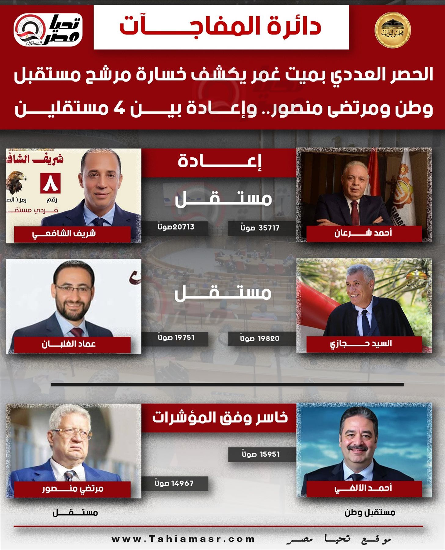 كشف الحصر العددي الخاص بانتخابات مجلس النواب بدائرة ميت غمر بمحافظة الغربية الكثير من المفاجأت في نتائج المرحلة الثانية من انتخابات مجلس النواب حيث تصدر المشهد المرشحون المستقلون وخسارة المستشار مرتضى منصور وخسارة مرشح حزب مستقبل وطن أحمد الألفي.
