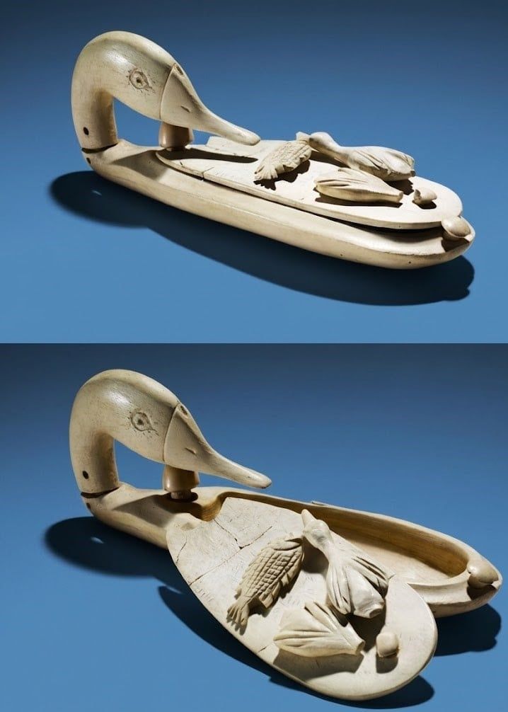 القطعة مصنوعة من عاج الفيل، وتشكل بطة تدير رأسها لتقديم سمكة لفرخيها الجالسين على ظهرها، في مشهد يعكس تفاصيل الحياة اليومية وعناية الأم بصغارها، وتشكل الأجنحة المغلقة غطاءً دوارًا يكشف عن تجويف داخلي استخدم لحفظ الزيوت أو الدهون العطرية.