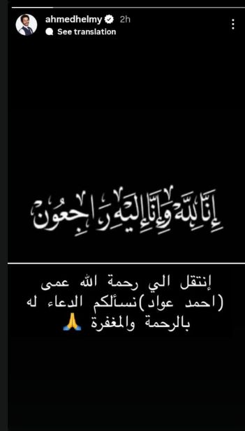 وكتب الفنان أحمد حلمي، منشورا، يعلن من خلاله وفاة عمه، وفقا لما رصده موقع تحيا مصر، وذلك عبر صفحته الرسمية على موقع التواصل الاجتماعي إنستجرام، قال فيه: إنا لله وإنا إليه راجعون، انتقل إلى رحمة الله تعالى عمي أحمد عواد، نسألكم الدعاء له بالرحمة والمغفرة.