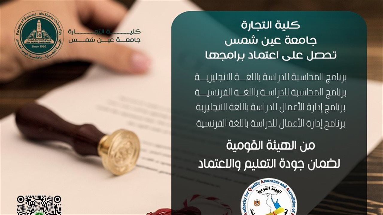 أعلنت كلية التجارة بجامعة عين شمس حصولها على الاعتماد البرامجي من الهيئة القومية لضمان الجودة والاعتماد (NAQAAE)، بعد اعتماد أربعة برامج أكاديمية متميزة داخل الكلية، وهي: برنامج إدارة الأعمال باللغة الإنجليزية، برنامج إدارة الأعمال باللغة الفرنسية، برنامج المحاسبة باللغة الإنجليزية، وبرنامج المحاسبة باللغة الفرنسية.