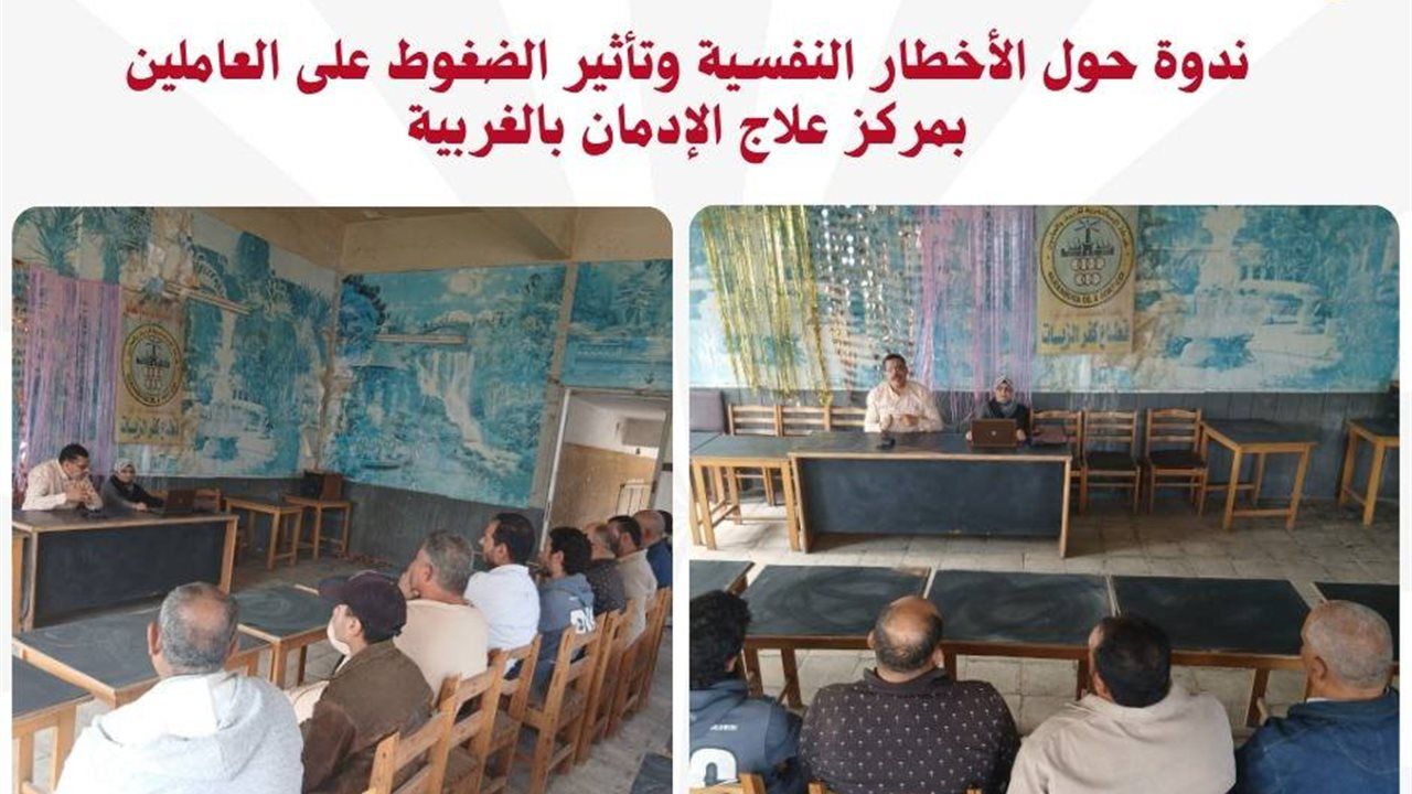 نظمت مديرية العمل بالغربية ندوة توعوية بمركز شبراقاص لعلاج الإدمان بمدينة السنطة، استهدفت توعية العاملين بأحكام قانون العمل الجديد وأهمية التعامل مع المخاطر النفسية الناتجة عن الضغوط في بيئة العمل، وذلك ضمن خطة المديرية لتعزيز الصحة النفسية والبيئة الآمنة للعاملين في مختلف القطاعات.