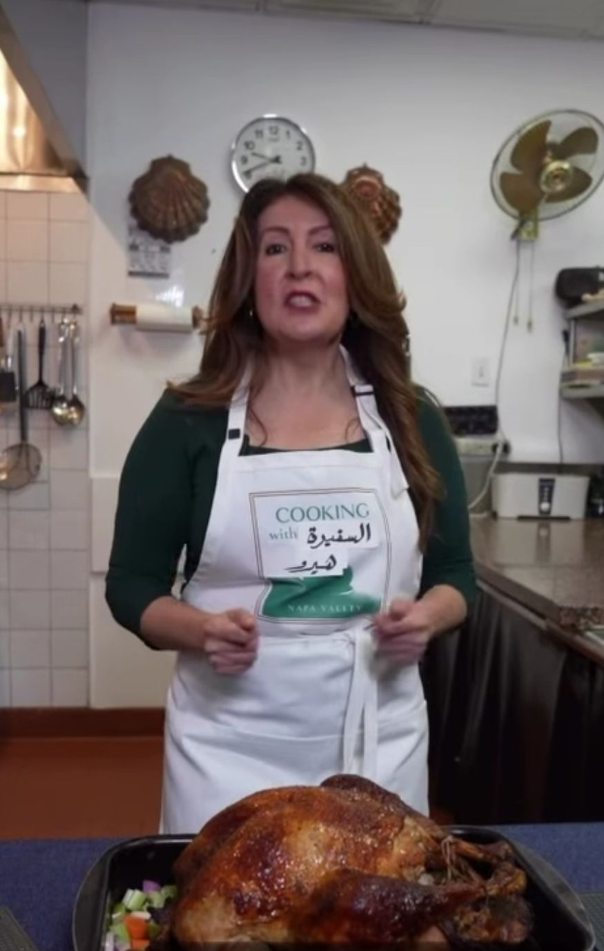 وتحدثت السفيرة الأميركية خلال إعدادها الطبق باللغة العامية وقالت:" اليوم عيد الشكر.. عطلتي الأمريكية المفضلة عندي ضيوف على العشاء.. أهم حاجة في الطبق هو الديك الرومي وأنا أحبكم مثل ما الدجاج يجب الديك".
