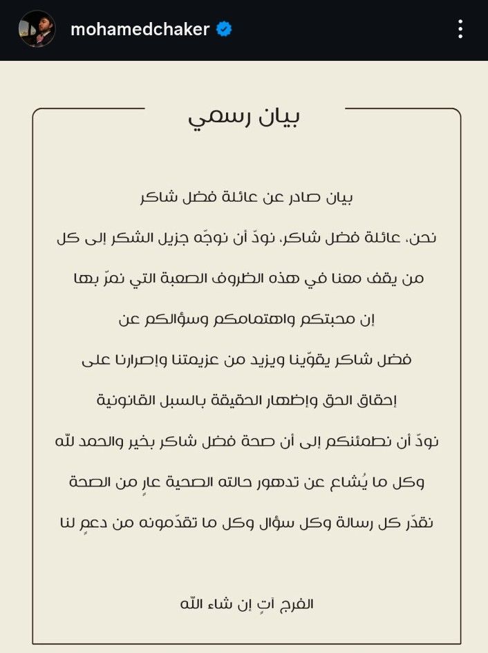 شارك نجل فضل شاكر متابعيه بيان رسمي صادر عن عائلة الفنان اللبناني يكشفون فيه حقيقة تدهور حالته الصحية داخل السجن، مؤكدين أنها أخبار عارية تماما من الصحة وأن حالة فضل شاكر الصحية بخير، وجاء البيان الذي رصده موقع تحيا مصر كالتالي: “بیان صادر عن عائلة فضل شاكر نحن عائلة فضل شاكر، نود أن نوجه جزيل الشكر إلى كل من يقف معنا في هذه الظروف الصعبة التي نمر بها إن محبتكم واهتمامكم وسؤالكم عن فضل شاكر يقوينا ويزيد من عزيمتنا وإصرارنا على إحقاق الحق وإظهار الحقيقة بالسبل القانونية نود أن نطمئنكم إلى أن صحة فضل شاكر بخير والحمد لله وكل ما يُشاع عن تدهور حالته الصحية عار من الصحة نقدر كل رسالة وكل سؤال وكل ما تقدمونه من دعم لنا، الفرج آت إن شاء الله”.