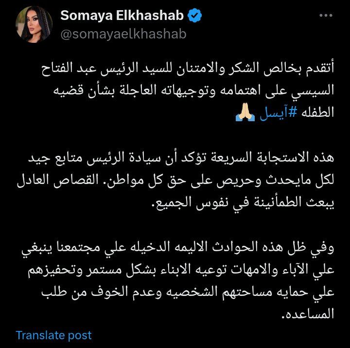 وكتبت سمية الخشاب في منشور رصده موقع تحيا مصر على حسابها الرسمي بموقع التدوينات القصيرة تويتر: أتقدم بخالص الشكر والامتنان للسيد الرئيس عبد الفتاح السيسي على اهتمامه وتوجيهاته العاجلة بشأن قضيه الطفله آيسل، هذه الاستجابة السريعة تؤكد أن سيادة الرئيس متابع جيد لكل مايحدث وحريص على حق كل مواطن. القصاص العادل يبعث الطمأنينة في نفوس الجميع.