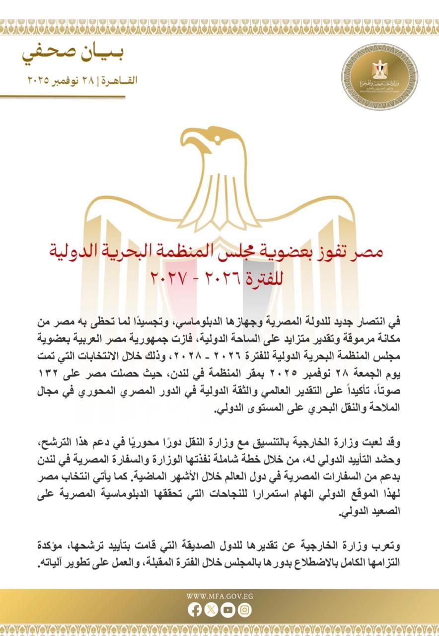 في انتصار جديد للدولة المصرية وجهازها الدبلوماسي، وتجسيدًا لما تحظى به مصر من مكانة مرموقة وتقدير متزايد على الساحة الدولية، فازت مصر بعضوية مجلس المنظمة البحرية الدولية للفترة ٢٠٢٦ - ٢٠٢٨، وذلك خلال الانتخابات التي تمت اليوم الجمعة، بمقر المنظمة في لندن.