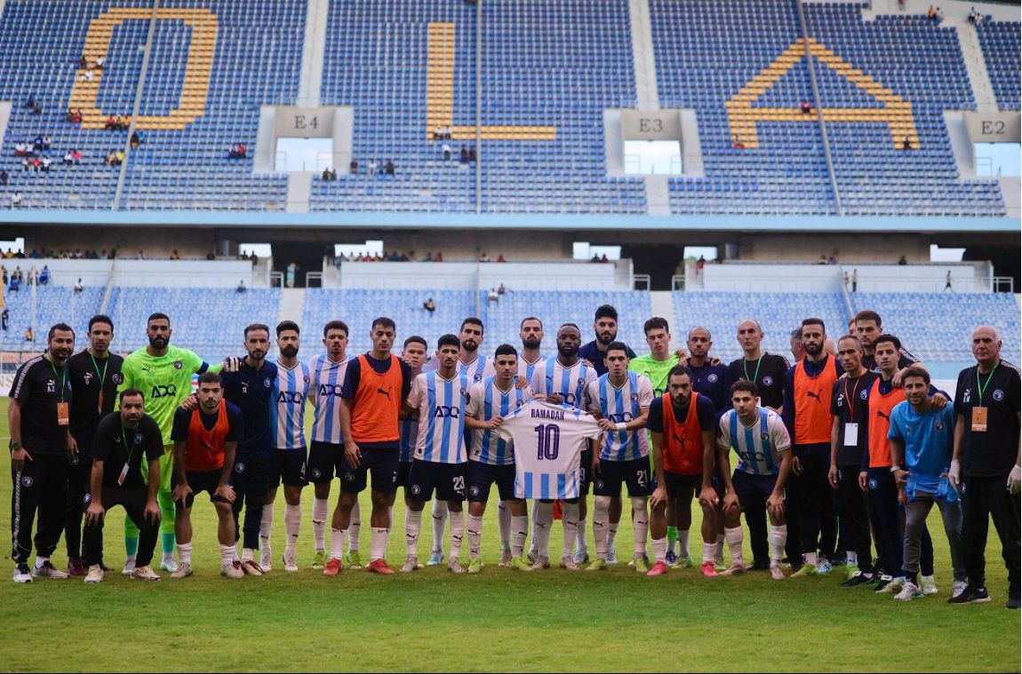 ورفع لاعبو الفريق والجهاز الفني والإداري والطبي قميص رمضان صبحي قبل انطلاق المباراة لدعم نجم الفريق.