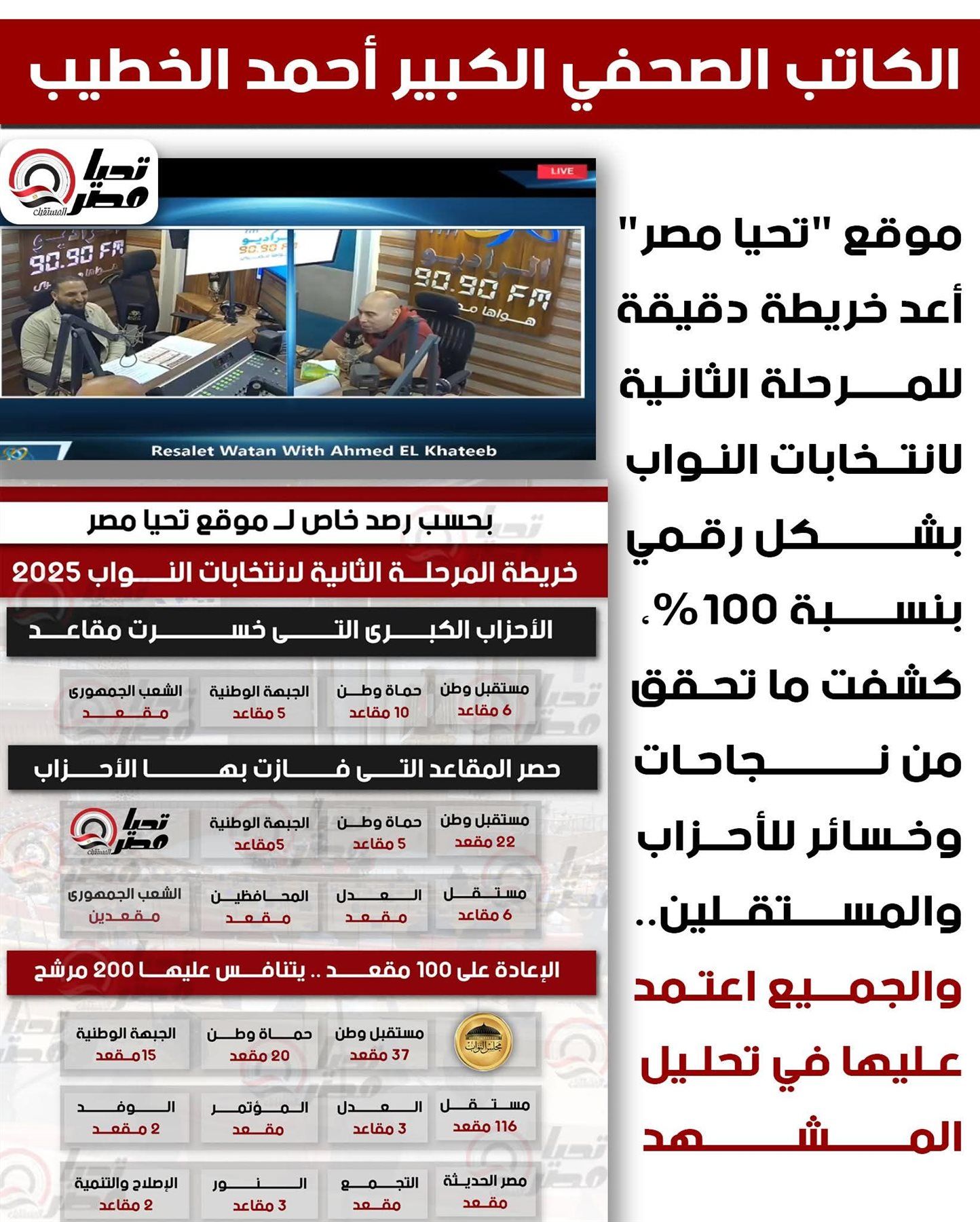 الكاتب الصحفي الكبير أحمد الخطيب: موقع «تحيا مصر» أعد خريطة دقيقة للمرحلة الثانية لانتخابات النواب بشكل رقمي بنسبة 100%.. والجميع اعتمد عليها في تحليل المشهد