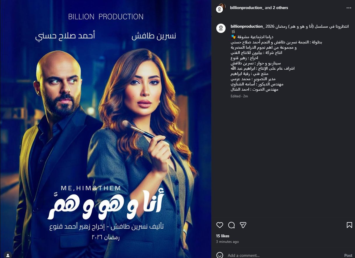 وشاركت الفنانة نسرين طافش، صورة تجمعها بالفنان أحمد صلاح حسني، وفقا لما رصده موقع تحيا مصر، وذلك عبر صفحتها الرسمية على موقع التواصل الاجتماعي إنستجرامن وعلقت عليها: انتظرونا في مسلسل (أنا و هو و هم ) رمضان 2026، دراما اجتماعية مشوقة، بطولة : النجمة نسرين طافش و النجم أحمد صلاح حسني، ومجموعة من اهم نجوم الدراما المصرية، انتاج شركة : بيليون للانتاج الفني، اخراج : زهير قنوع، سيناريو و حوار : نسرين طافش، اشراف عام على الإنتاج : ابراهيم عبد الله، منتج فني : رقية ابراهيم، مدير التصوير : محمد عزمي، مهندس الديكور : أسامه الشناوي، مهندس الصوت : احمد الشال.