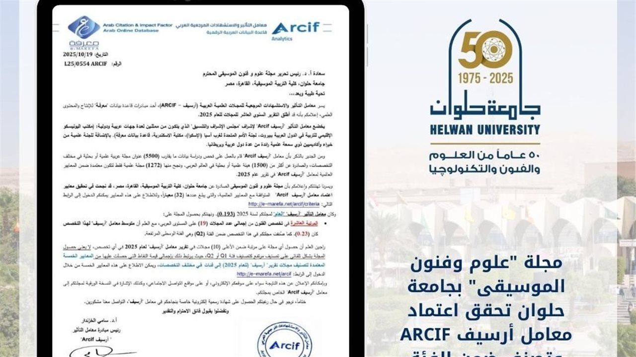 في إنجاز علمي وبحثي جديد يُضاف إلى رصيد كلية التربية الموسيقية بجامعة حلوان، أعلنت معامل التأثير والاستشهادات المرجعية للمجلات العلمية العربية، أرسيف، إحدى مبادرات قاعدة بيانات "معرفة للإنتاج والمحتوى العلمي"، عن اعتماد مجلة "علوم وفنون الموسيقى" الصادرة عن الكلية ضمن قوائمها المرموقة لعام 2025، بعد استيفائها 32 معيارًا عالميًّا للتقييم.