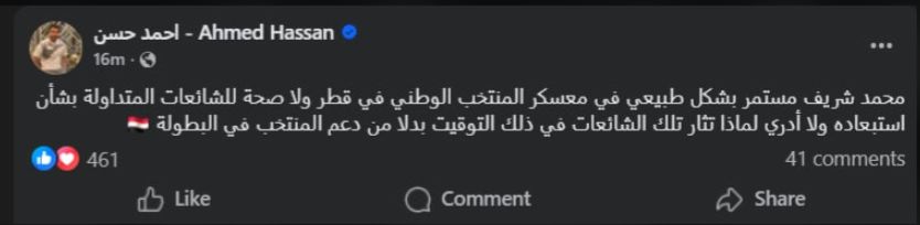 تحيا مصر، وكتب أحمد حسن عبر حسابه الرسمي" فيس بوك": محمد شريف مستمر بشكل طبيعي في معسكر المنتخب الوطني في قطر ولا صحة للشائعات المتداولة بشأن استبعاده، ولا أدري لماذا تثار تلك الشائعات في ذلك التوقيت بدلاً من دعم المنتخب في البطولة".