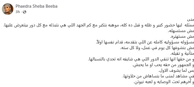 وكتبت الفنانة فيدرا، منشورا تدعم من خلاله الفنان منى زكي، وفقا لما رصده موقع تحيا مصر، عبر صفحتها الشخصية علىا موقع التواصل الاجتماعي فيسبوك، قالت فيه:منى، ممثلة ليها حضور كبير وطله وقبل ده كله، موهبة بتكبر مع كم الجهد اللي هي بتبذله مع كل دور بيتعرض عليها، مش مستسهله، مش مستهترة، مسئولة مسؤوليه كامله عن اللي بتقدمه، قدام نفسها اولاً، مش بنشوفها كل يوم في عمل، ولا كل سنه، متأنية و تقيله، ومن حقها انها تنقي الدور اللي هي شايفة انه تحدي بالنسبالها.