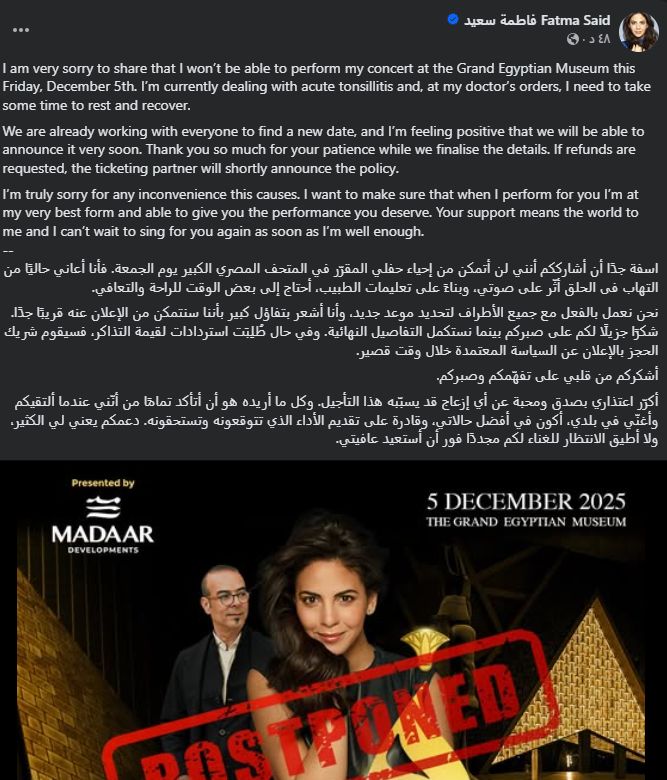 وكتبت السوبرانو فاطمة سعيد، منشورا توضح من خلاله سبب اعتذارها عن حفل المتحف المصري الكبير، وفقا لمار صده موقع تحيا مصر، وذلك عبر صفحتها الرسمية على موقع التواصل الاجتماعي فيسبوك، وقالت فيه: اسفة جدا أن اشارككم انني لن اتكمن من إحياء حفلي المقرر في المتحف المصري الكبير يوم الجمعة، فأنا أعاني حاليا من التهاب في الحلق أثر على صوتي، وبناءً على تعليمات الطبيب احتاج إلى بعض الوقت للراحي والتعافي.