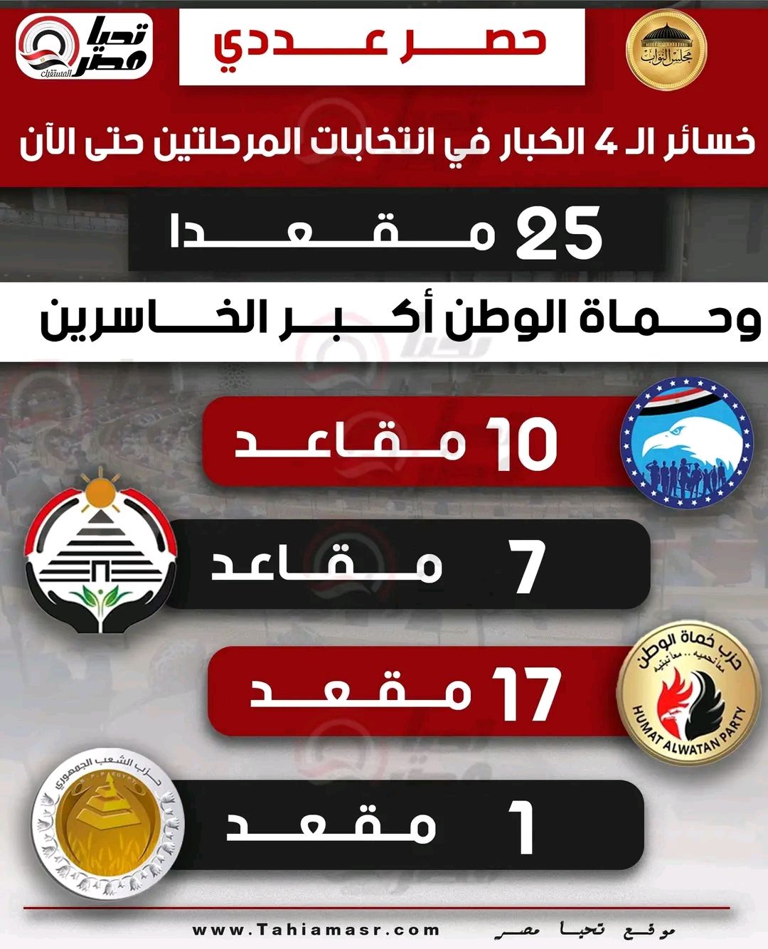 وفي المقابل، تلقّى الحزب خسارة مباشرة لـ 4 مقاعد خرجت من السباق، ما يعكس تراجعًا نسبيًا مقارنة بنتائج دورات انتخابية سابقة رغم استمرار حضوره الواسع في مختلف المحافظات.