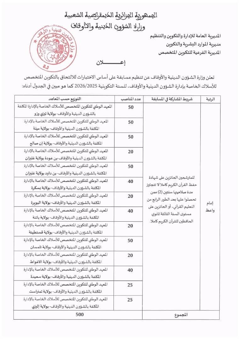 ووفق بيان الوزارة، فإن عدد المناصب المتوفرة يبلغ 500 منصب موزّعة على 14 معهداً عبر مختلف ولايات الوطن.