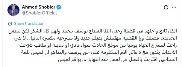 تحيا مصر، وكتب أحمد شوبير عبر حسابه الرسمي"فيس بوك":" الكل تابع واجتهد في قضية رحيل ابننا السباح يوسف محمد، ولهم كل الشكر لكن لميس الحديدى فضلت ورا القضية مهتمتش بفيلم جديد ولا مسرحية مكسره الدنيا".