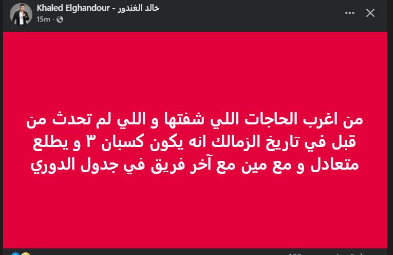 تحيا مصر، وكتب خالد الغندور عبر حسابه الرسمي"فيس بوك": من أغرب الحاجات اللي شفتها، واللي لم تحدث من قبل في تاريخ الزمالك انه يكون كسبان ٣، و يطلع متعادل و مع مين مع آخر فريق في جدول الدوري ".